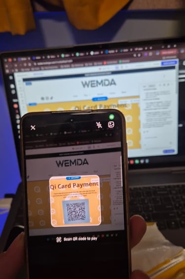 بعد الضغط على «Scan QR»، وجّه الكاميرا نحو رمز QR الخاص بدفع بطاقة Qi الموجود في صفحة الدفع لدينا. راجع المبلغ ثم اضغط على «Confirm» لإتمام الدفع.
