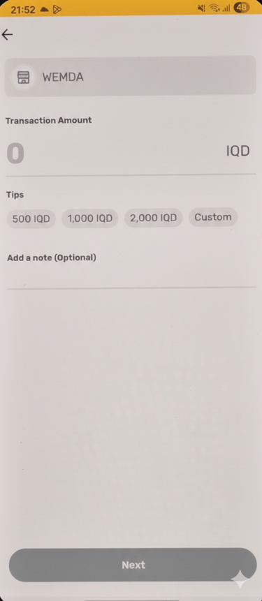 أدخل نفس المبلغ الظاهر في صفحة الدفع الخاصة بـ ويمدا بالدينار العراقي (IQD). تأكّد من المبلغ جيدًا، ثم اضغط على «Next» للمتابعة.