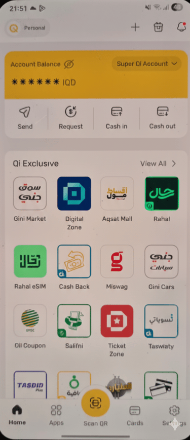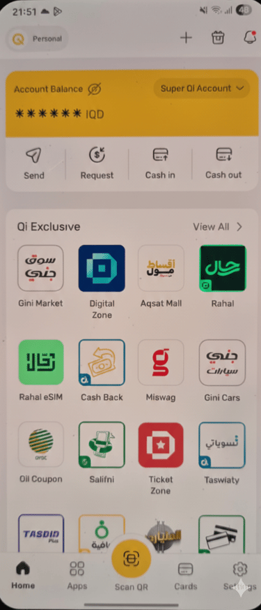 افتح تطبيق بطاقة Qi. من الشاشة الرئيسية، اضغط على زر «Scan QR» الأصفر في أسفل المنتصف لبدء عملية الدفع.