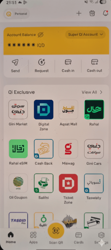 Open your Qi Card app. On the home screen, press the yellow “Scan QR” button at the bottom center to start the payment.