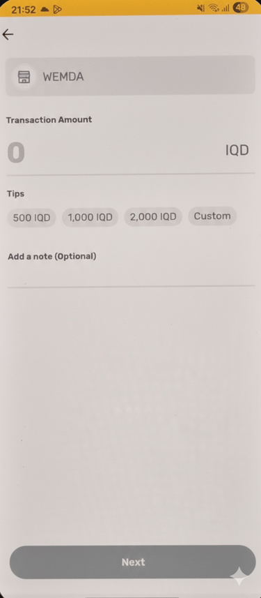 هەمان بڕی پارەی نیشاندراو لە پەڕەی پارەدانی وێمدا تۆمار بکە بە دیناری عێراقی (IQD). بڕەکە دووبارە پشکنین بکە، پاشان «Next» دابگرە بۆ بەردەوامبوون.