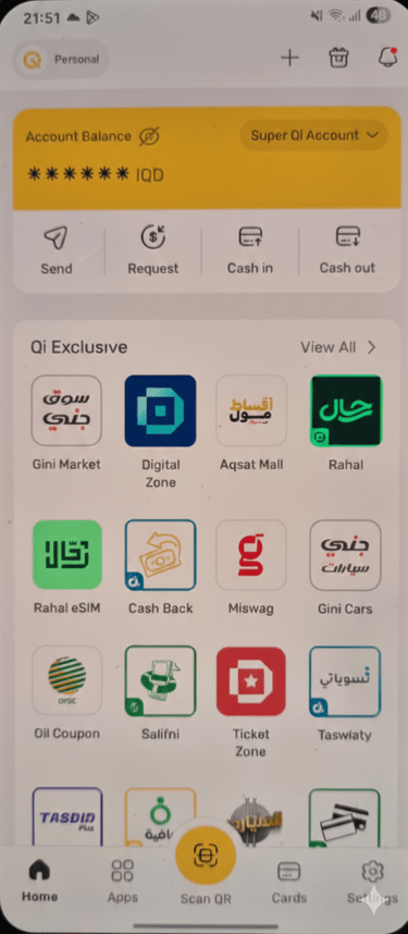 ئەپی ئاپی Qi بکەرەوە. لە پەڕەی سەرەکی، دوگمەی زەردی «Scan QR» لە ناوەندی خوارەوە دابگرە بۆ دەستپێکردنی پارەدان.